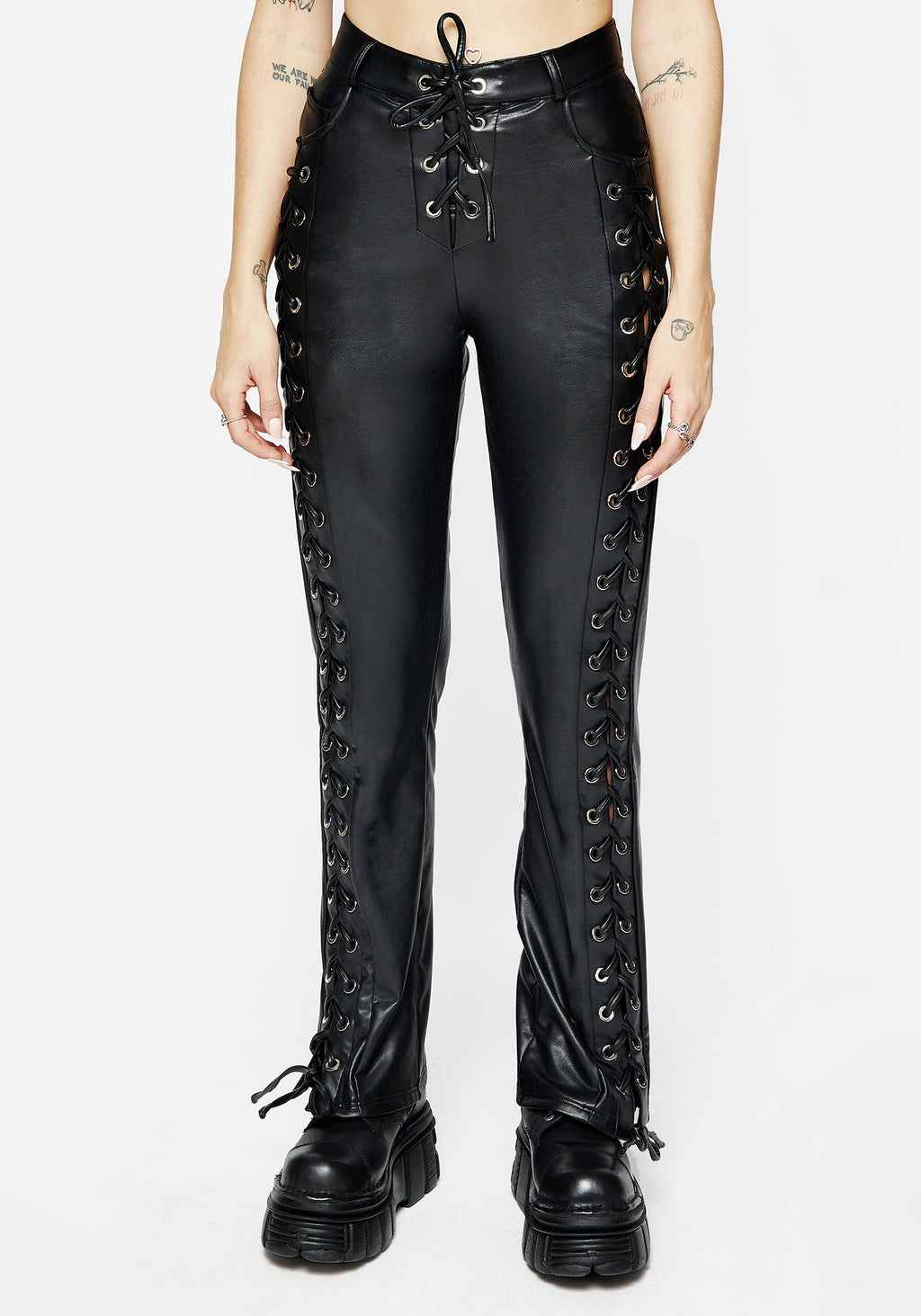 - PU leather cords thread through silver metal eyelets along leg side seams