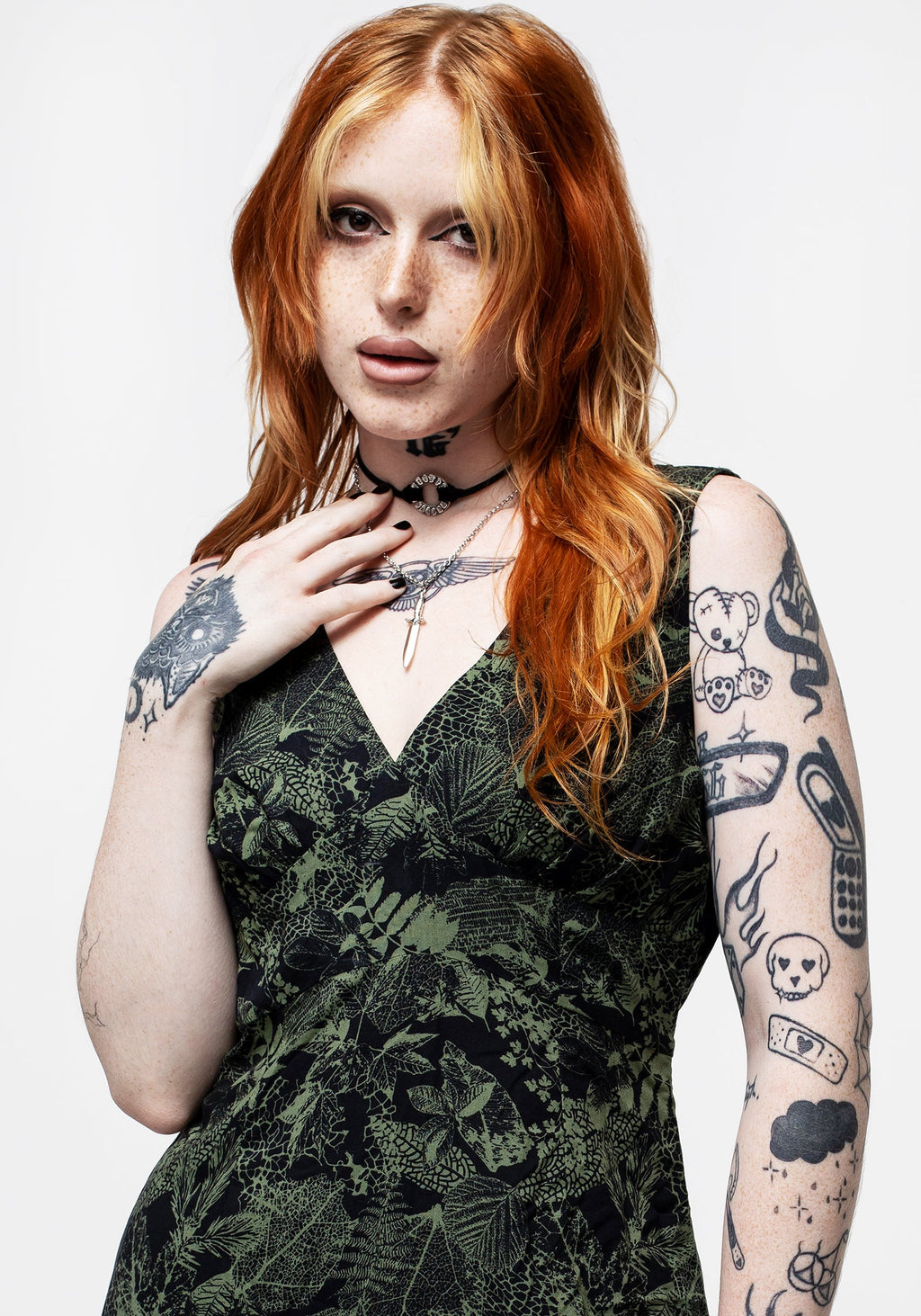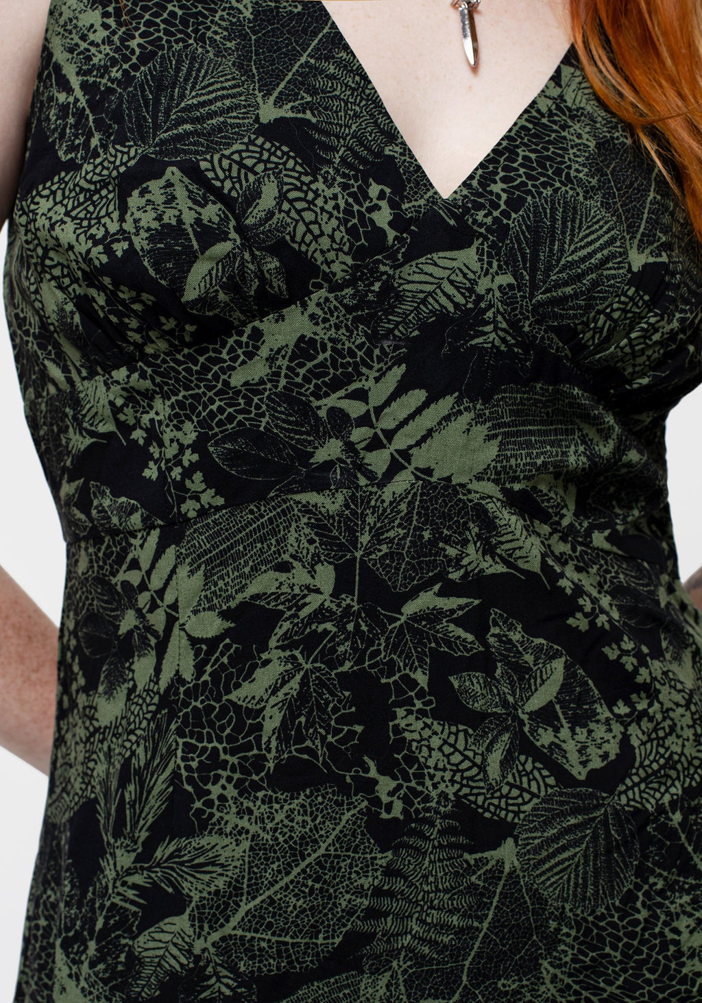 - Black & green leaf print V-necked mini dress