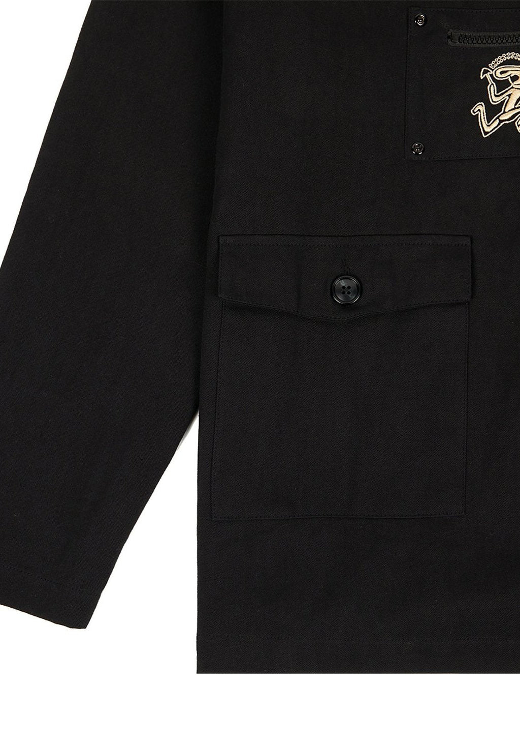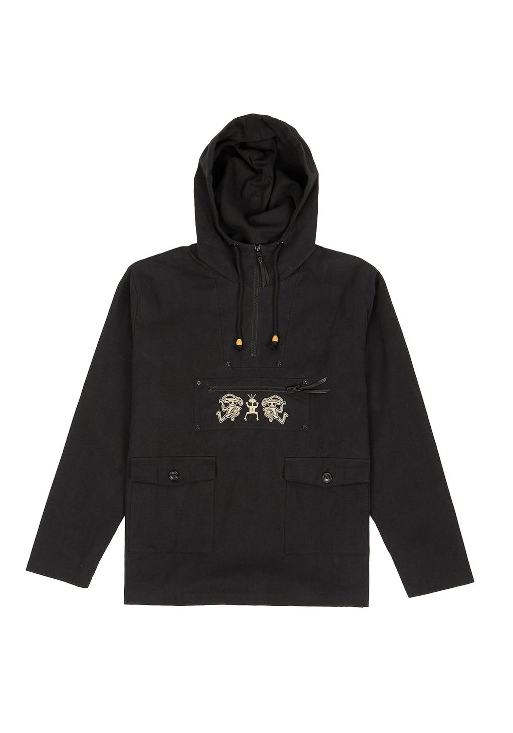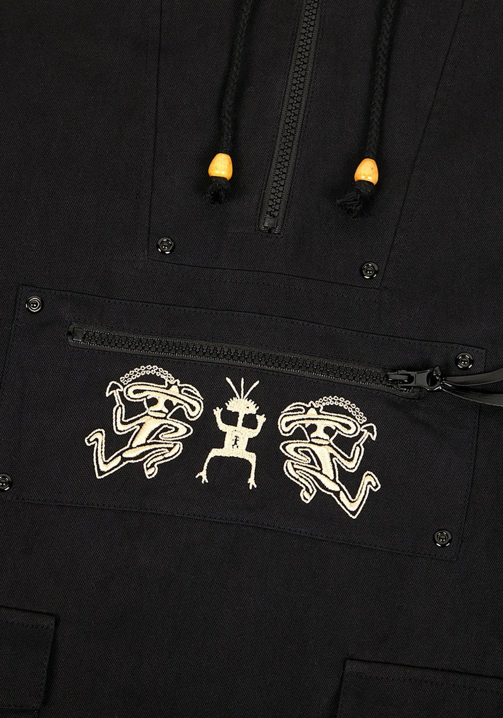- Front chest pocket features: ancient mushroom cave-people embroidery in calm sandy shade & functional zip fastening with faux leather zip pulls