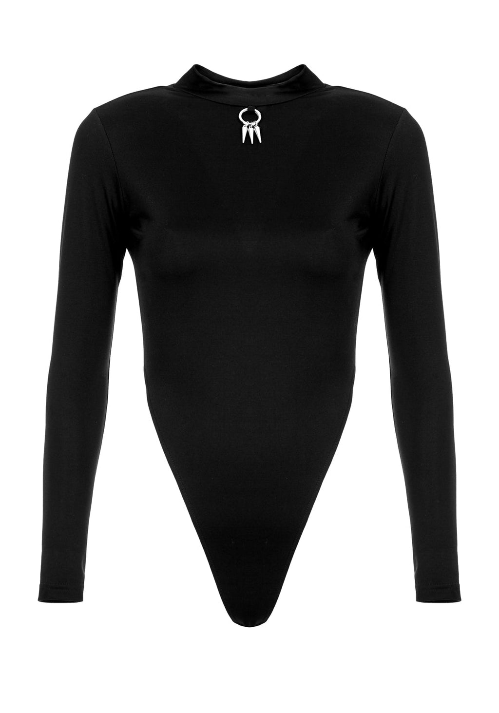 ✷ Ring & spike silver metal hardware at centre-front mock neckline (removable for washing)
