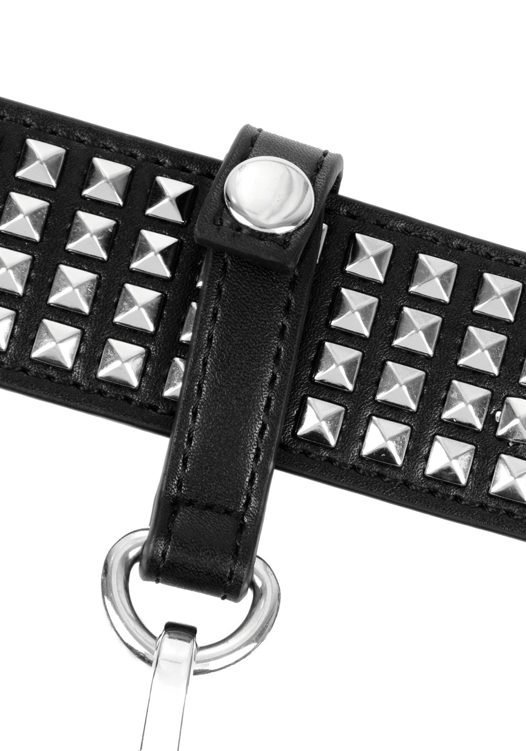 ‚ Detachable chain fastens with pop-studded leather loops and swivel clasps