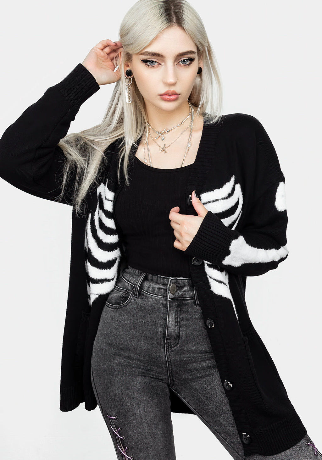 ✦ Contrasting white skeleton intarsia kit pattern on front, back, and sleeves