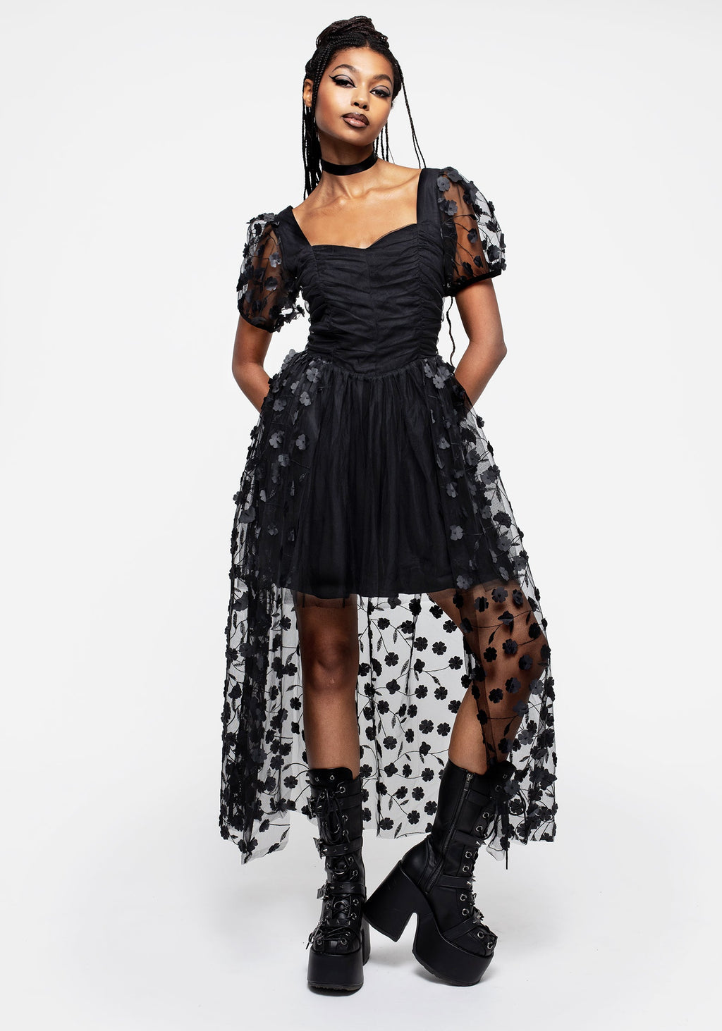- Black tulle mini dress with floral applique maxi-length overskirt