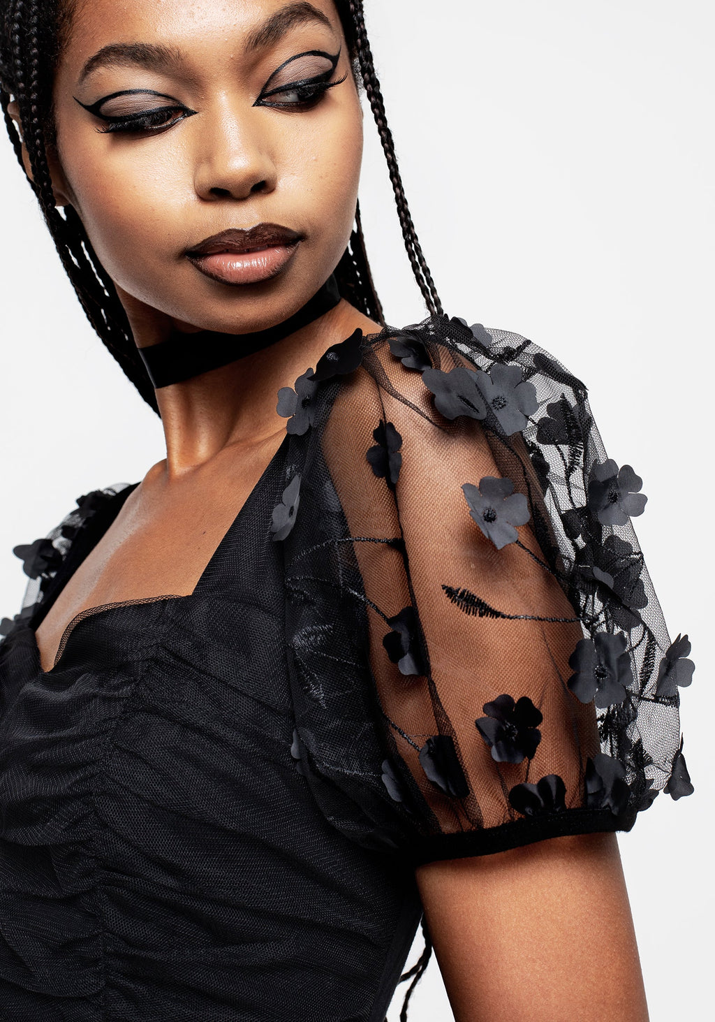 - Sheer black tulle overlays a solid black lining