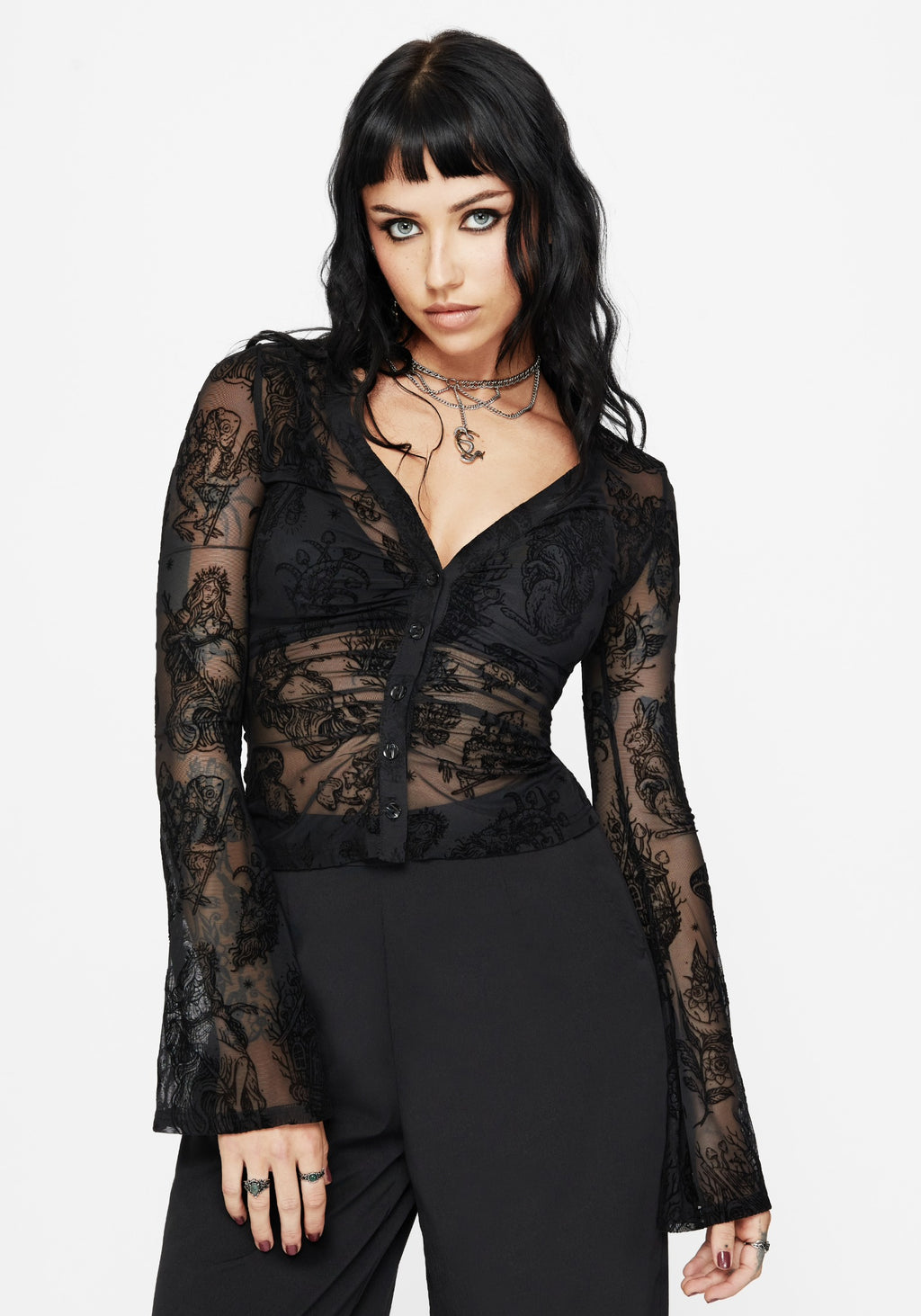 Hexborn Baba Yaga Flocked Button Down Mesh Top