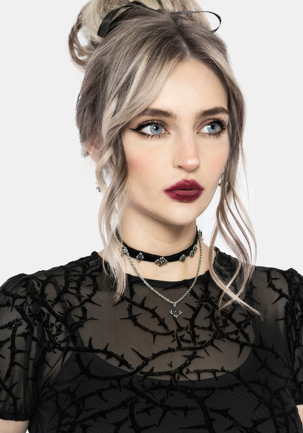 Prickle Thorn Print Mesh Puff Sleeve Mini Dress - Black