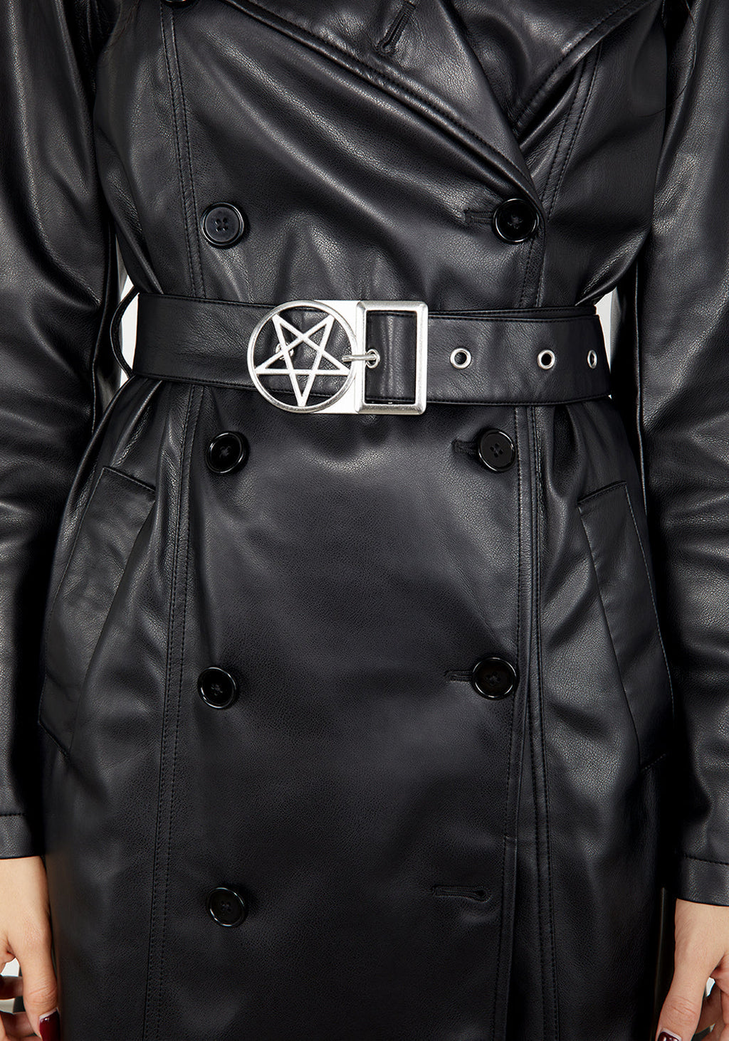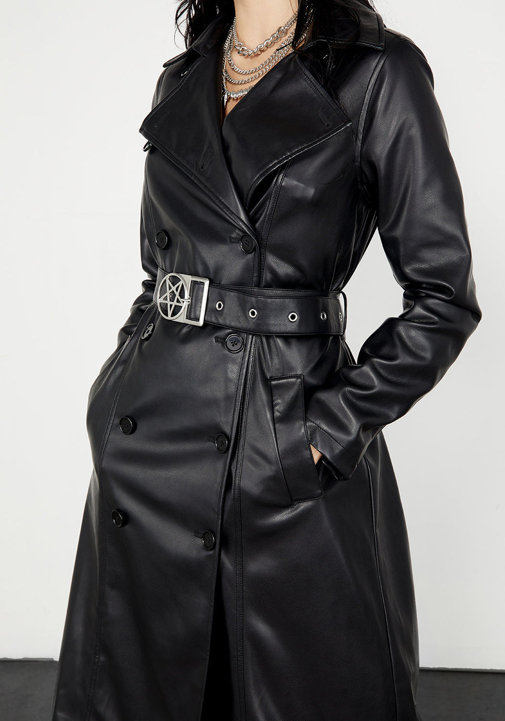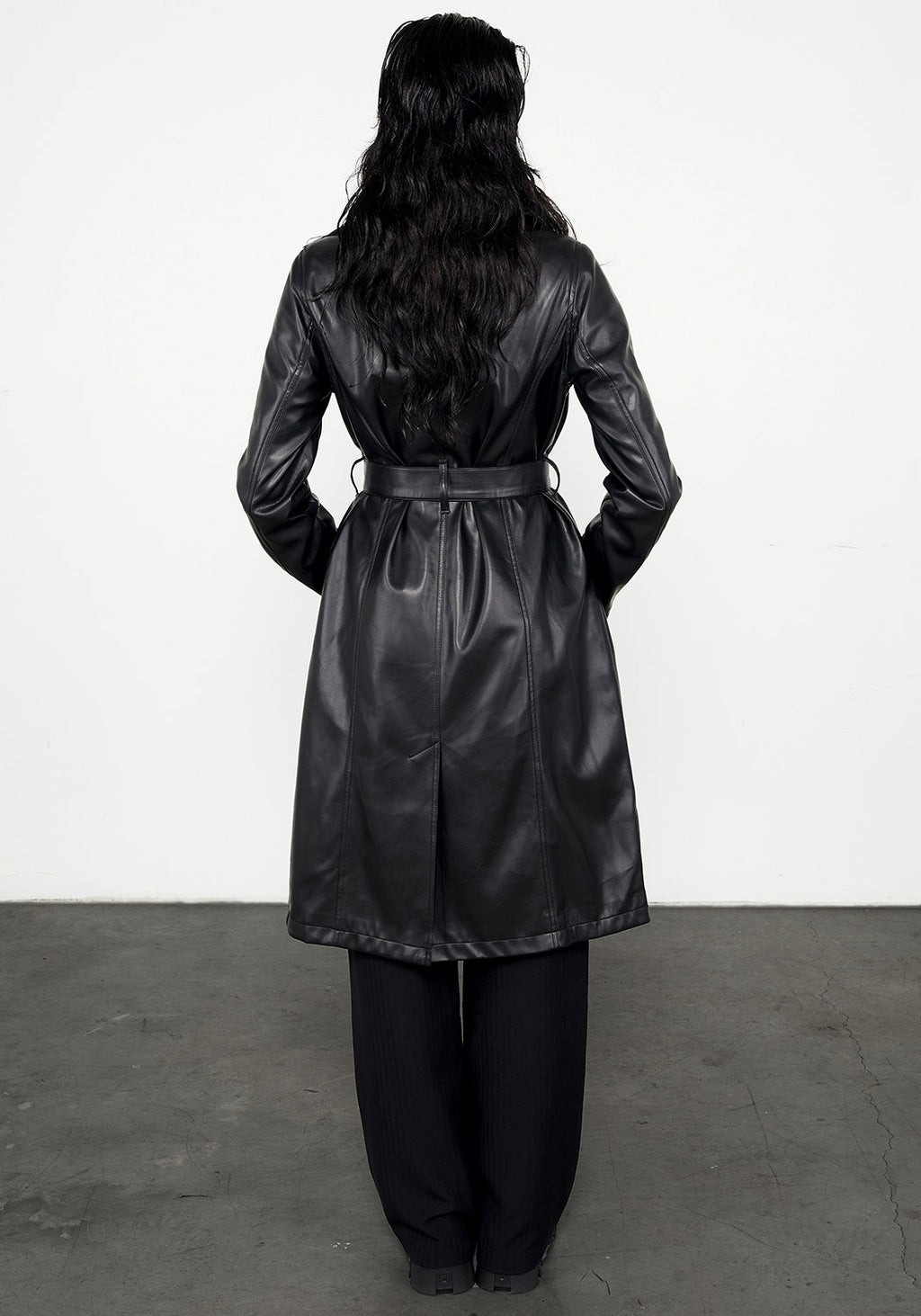 - Belted faux leather trench coat