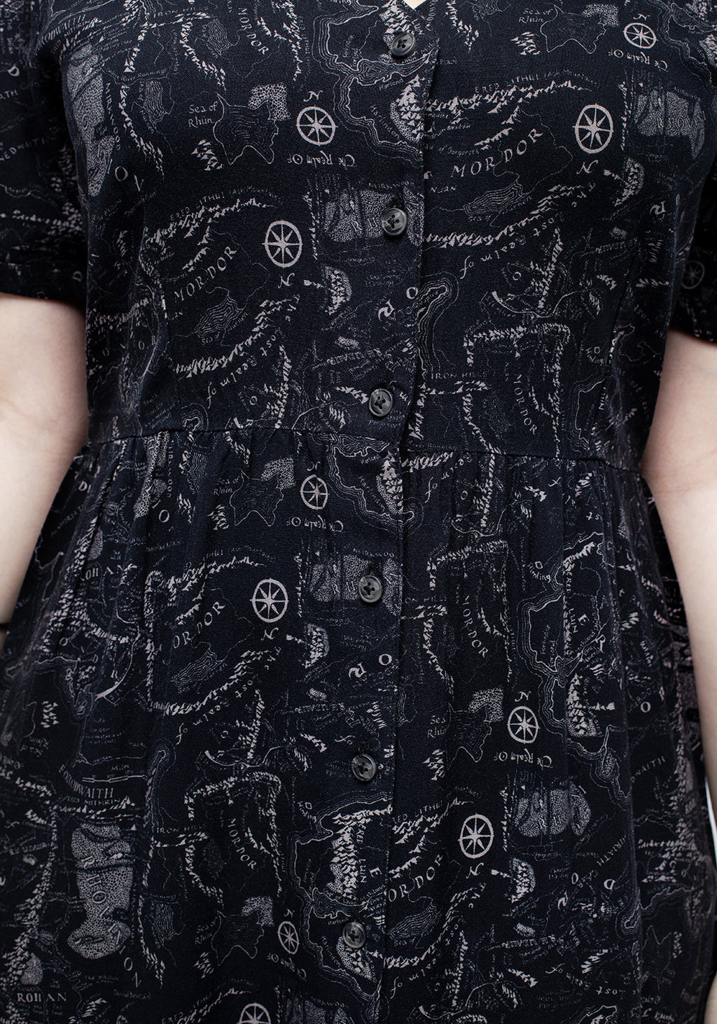 - Multi-directional fantastical map print on a rich midnight black base