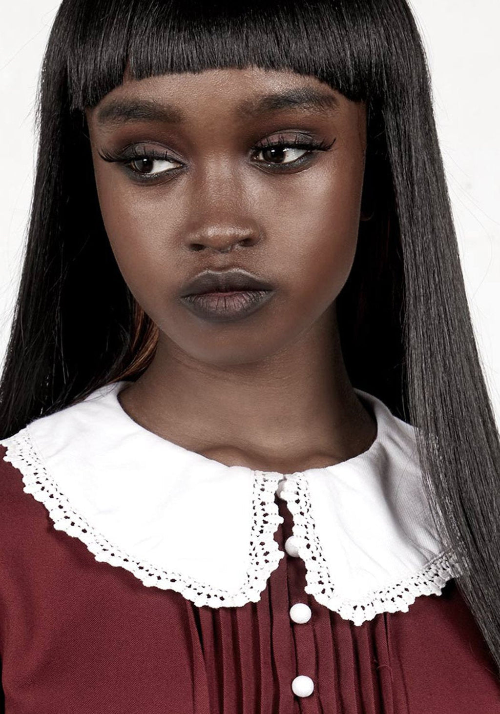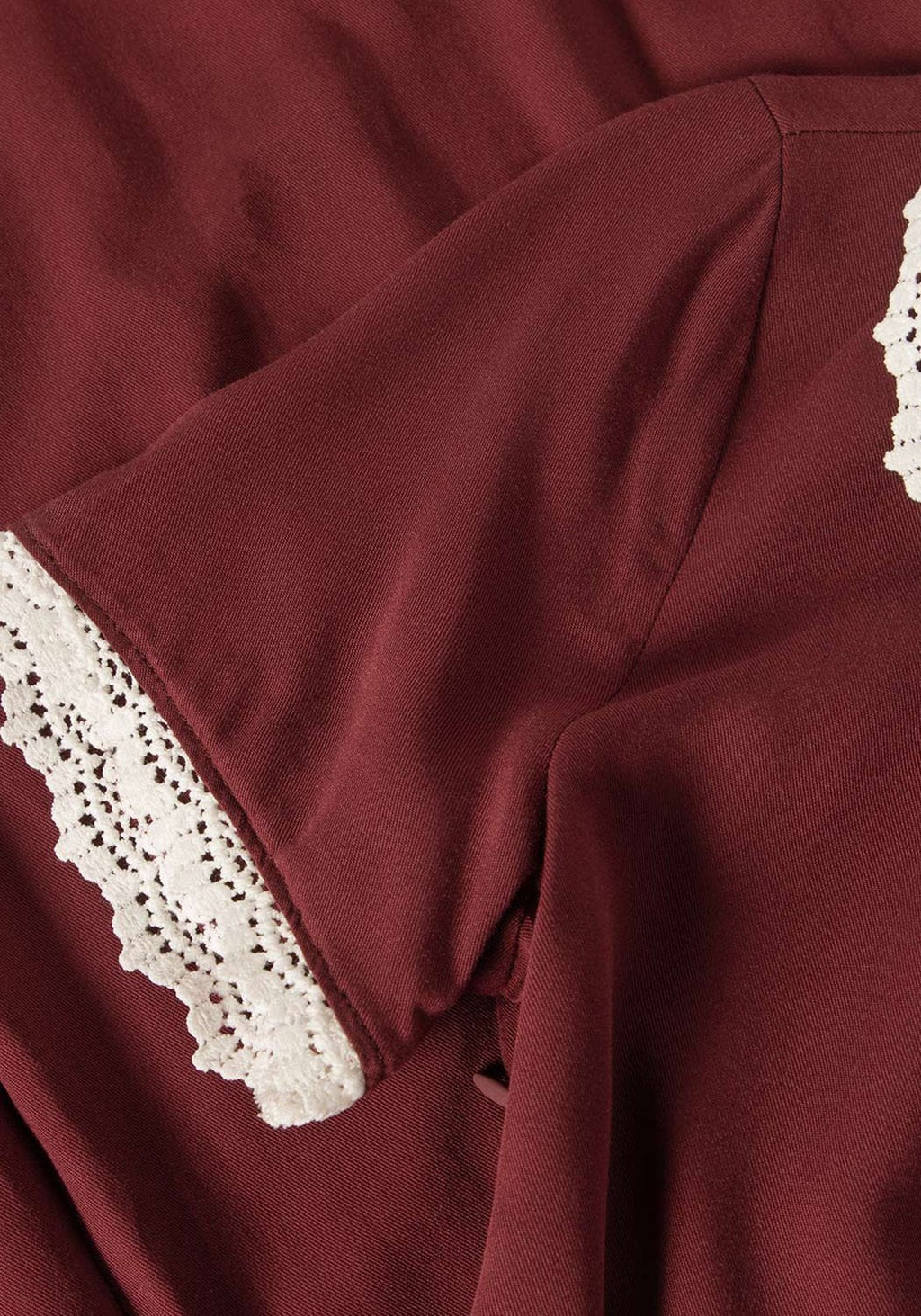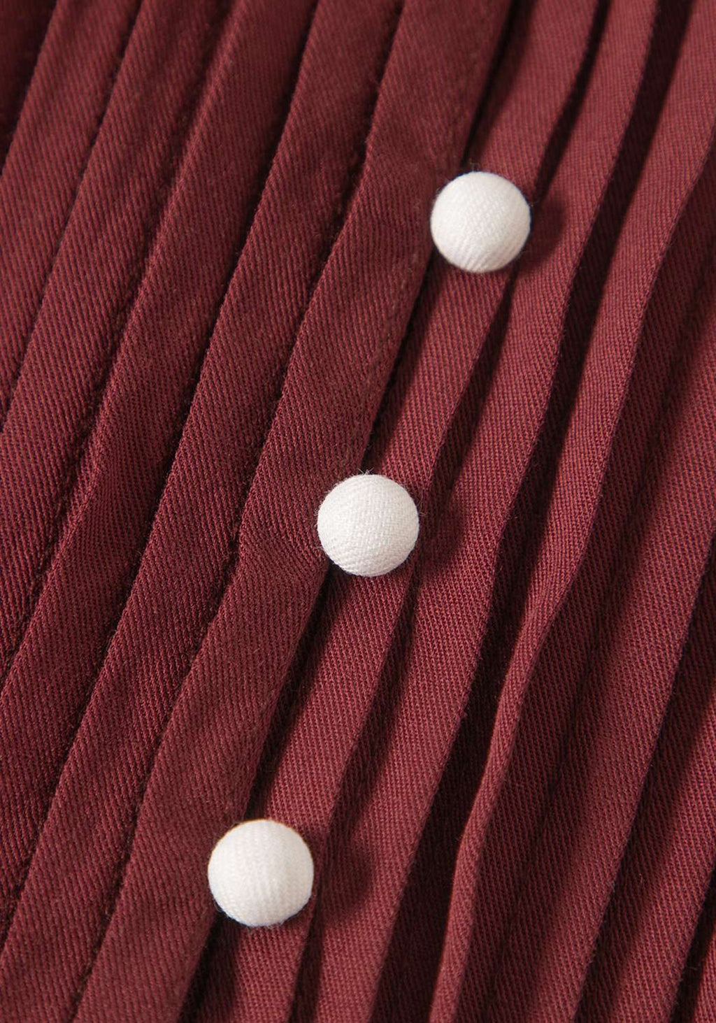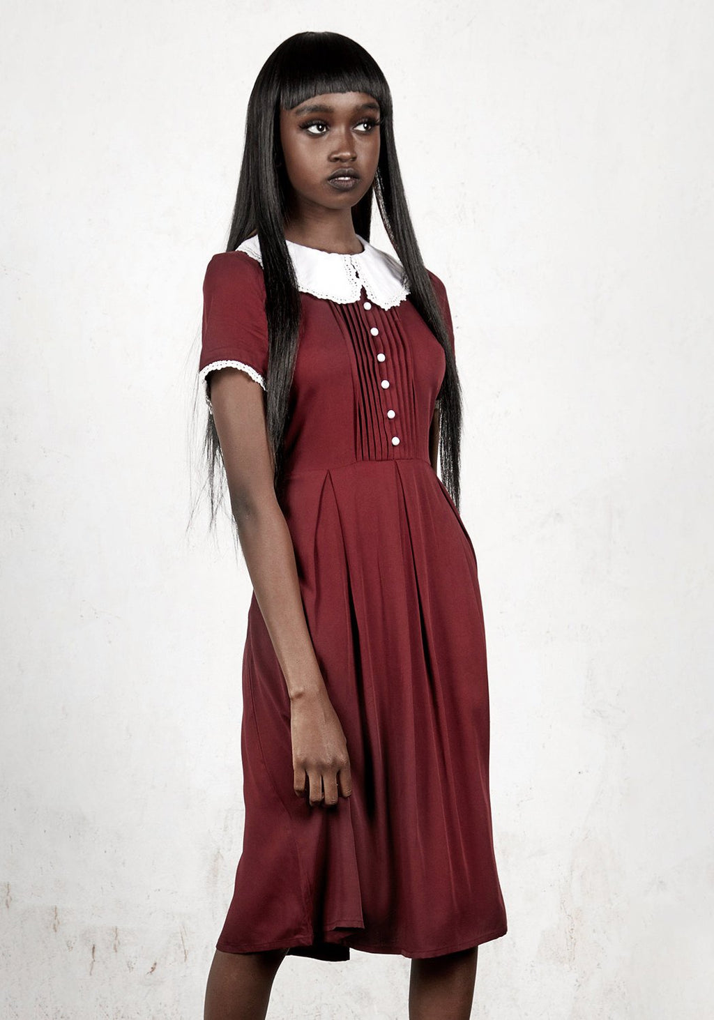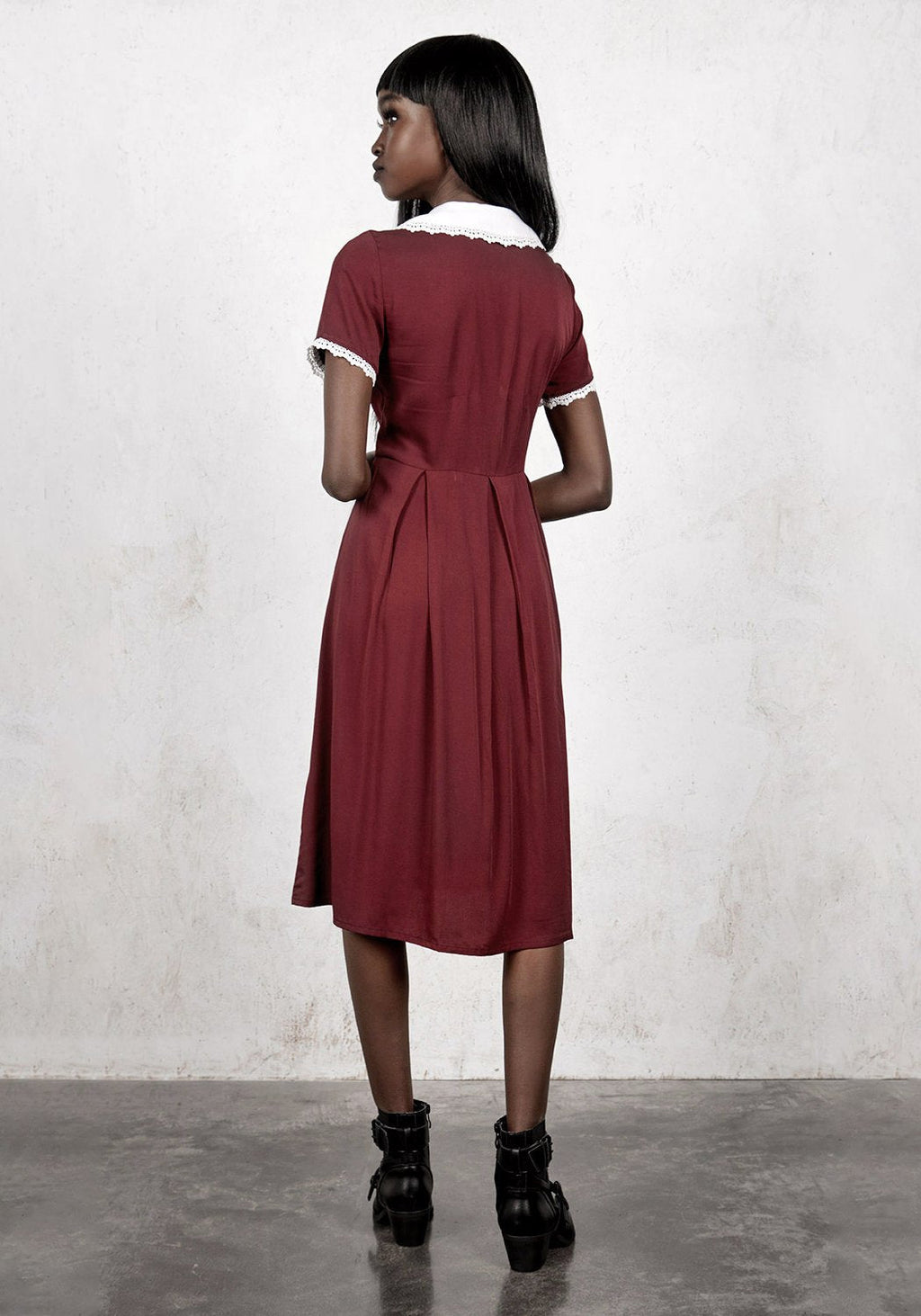 Fitted button up midi dress with lace collar trim and pin tuck bodice detail.