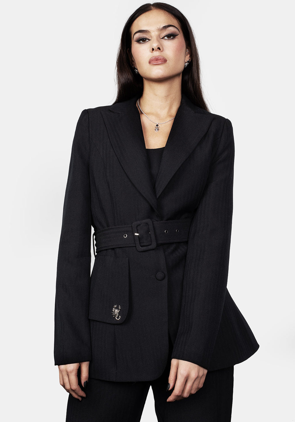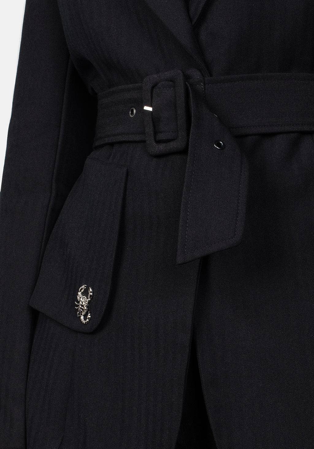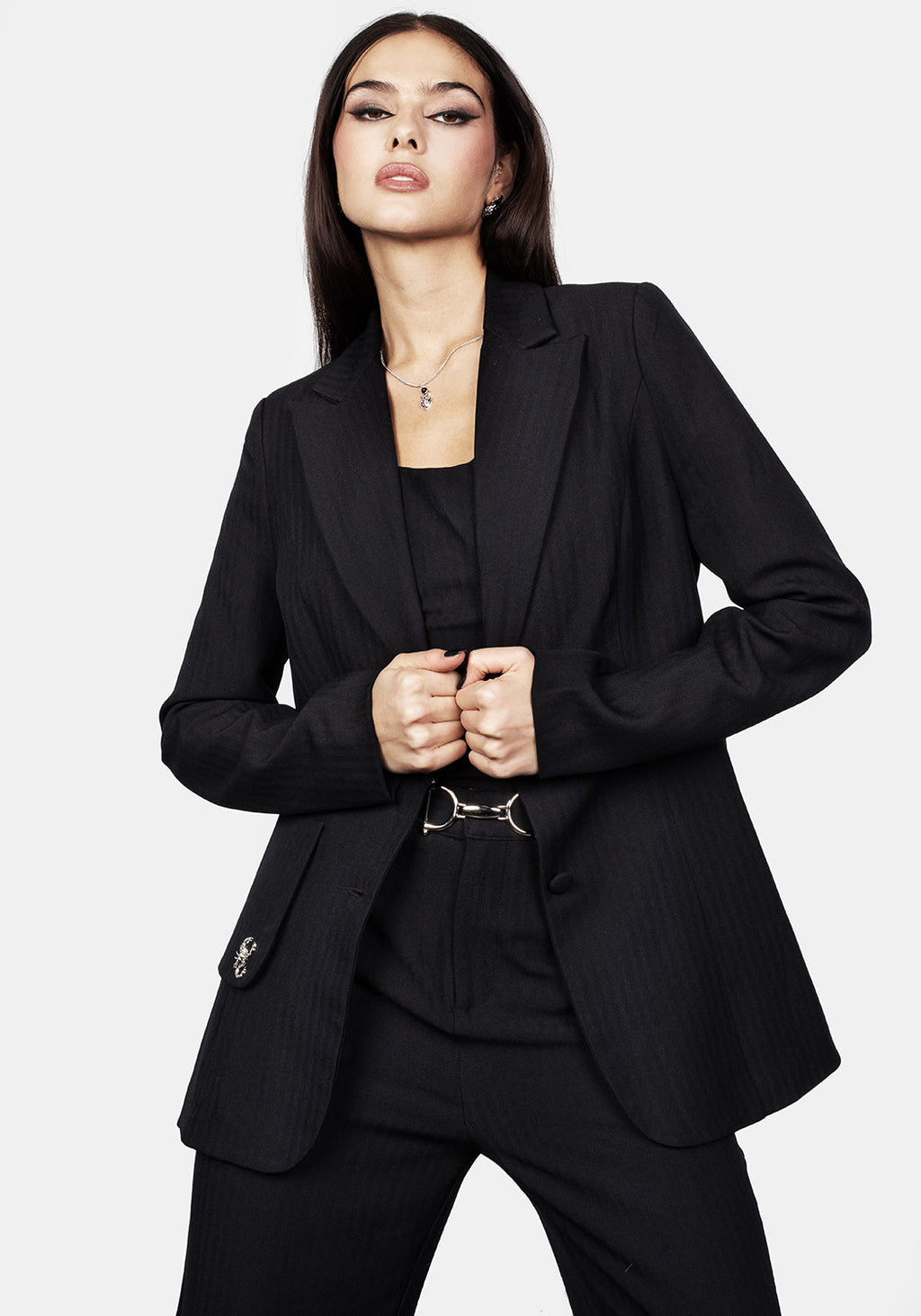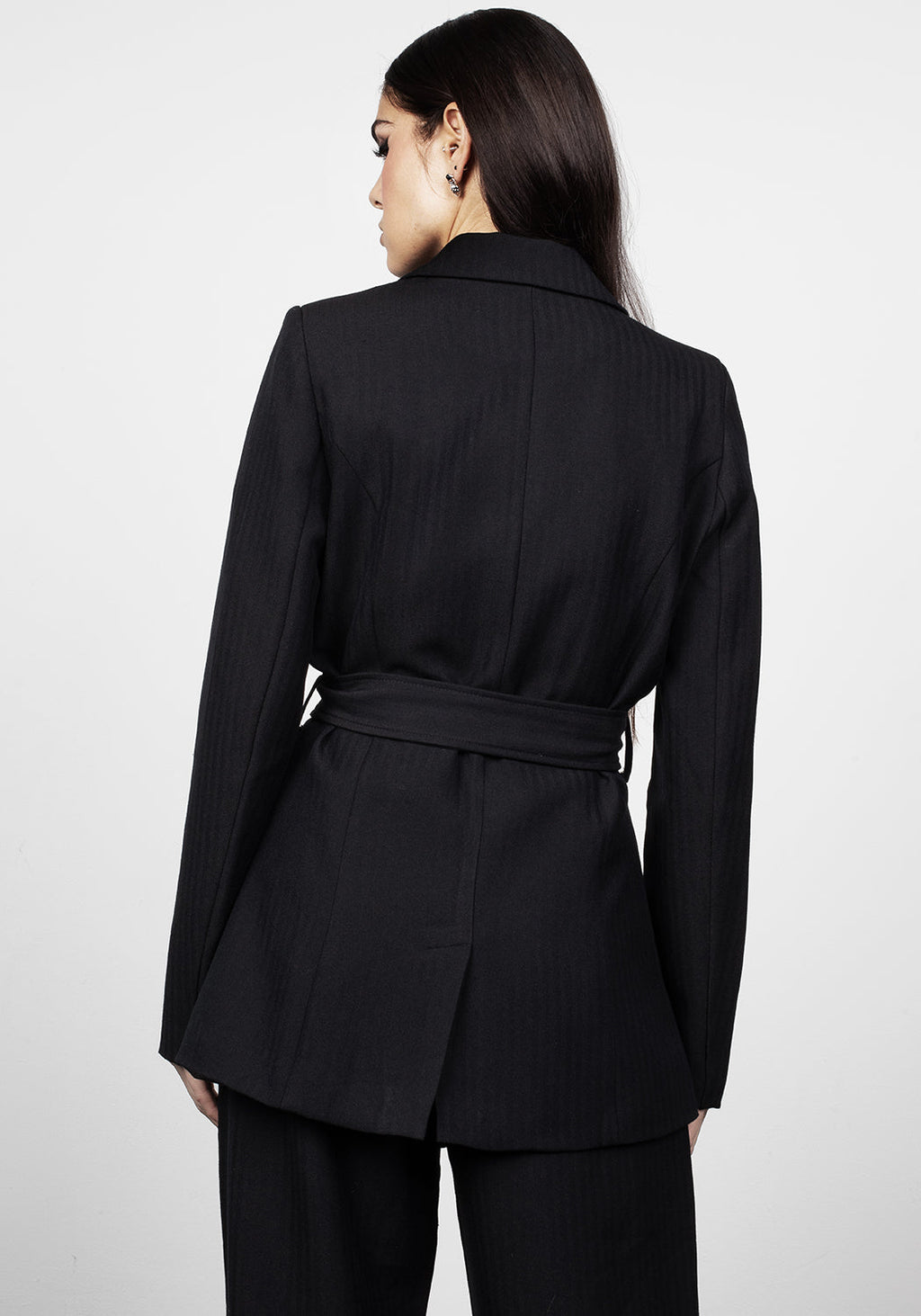 - Soft black shadow-striped herringbone twill fabric (non-stretch)