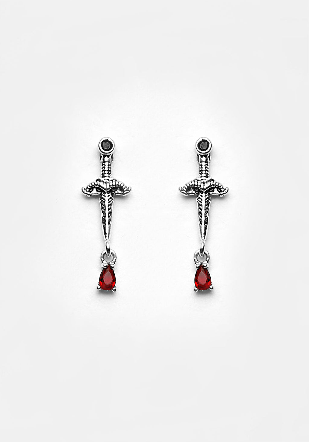 Yours to take with blood and fire, these small-but-mighty dagger studs show you're not to be messed with. Lightweight and silver-plated, with a jet-black Cubic Zirconia crystal in the handle to protect from unseen enemies. Most striking is the tiny blood-red teardrop charm, which elegantly sways below the dagger for vampy drama. Fasten with the clutch-back clasp, then add blood red lips to hypnotize lovers.