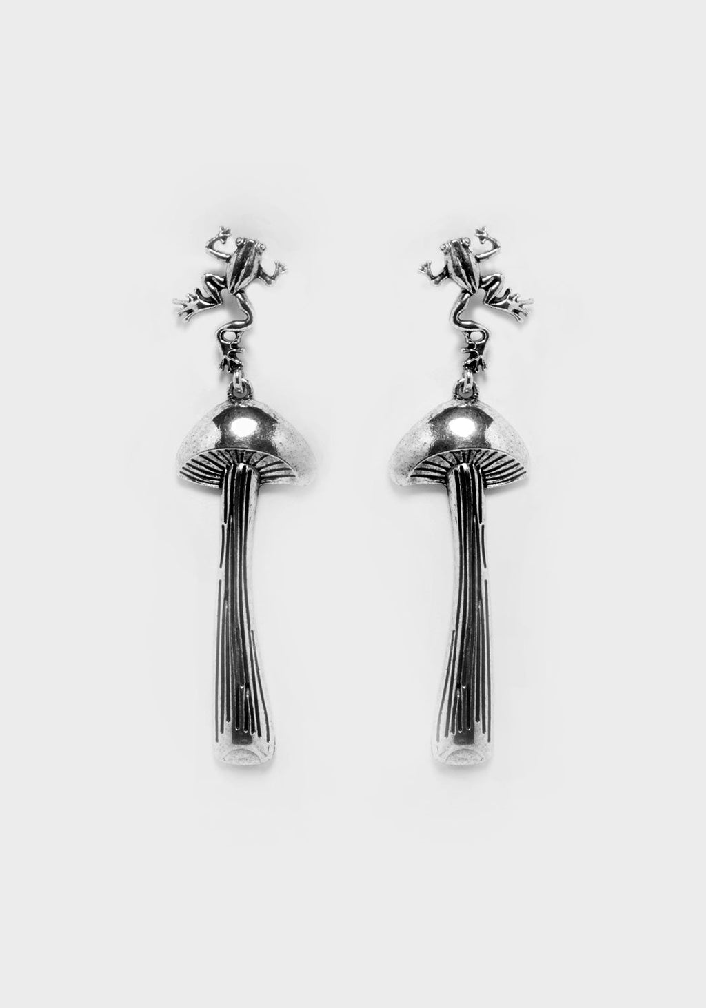 Everybody loves an underdog. Sneak in under the radar with the Lazarus Earrings: dainty frog studs cling to your lobe piercing while a three dimensional ‘shroom charm hangs from the little guy’s foot. Channel your inner swampwitch and add these to your outfit on your next foraging trip.