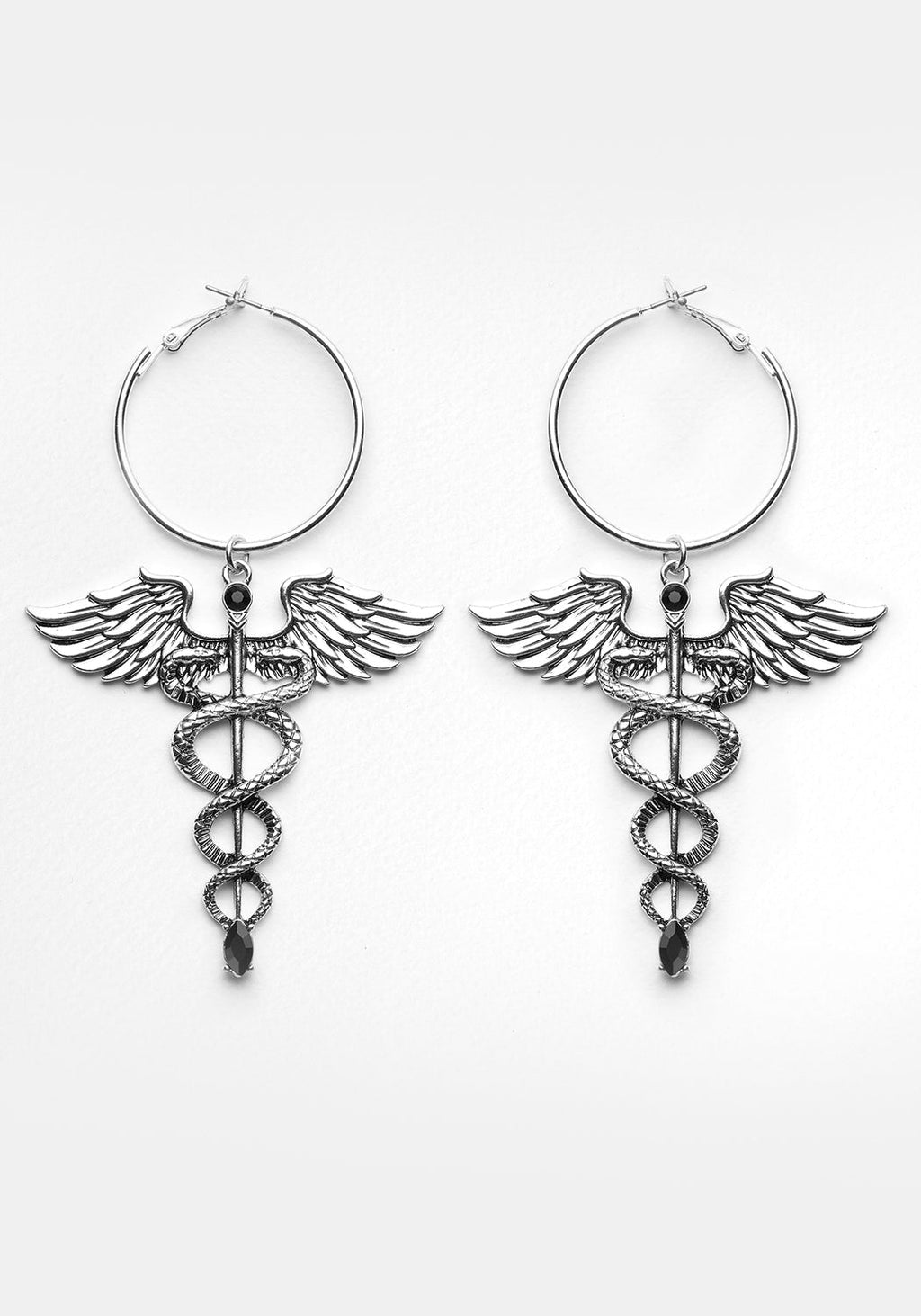 May the winged staff of Hermes bring mischief & magick into your life, as it elegantly hangs from your ears. Entwined with two serpents, the engraved caduceus drops are finished with faceted round and oval gemstones in jet black. With silver hoops and a simple snap-back fastening, Caduceus Hoop Earrings can be worn in stretched and unstretched lobes.