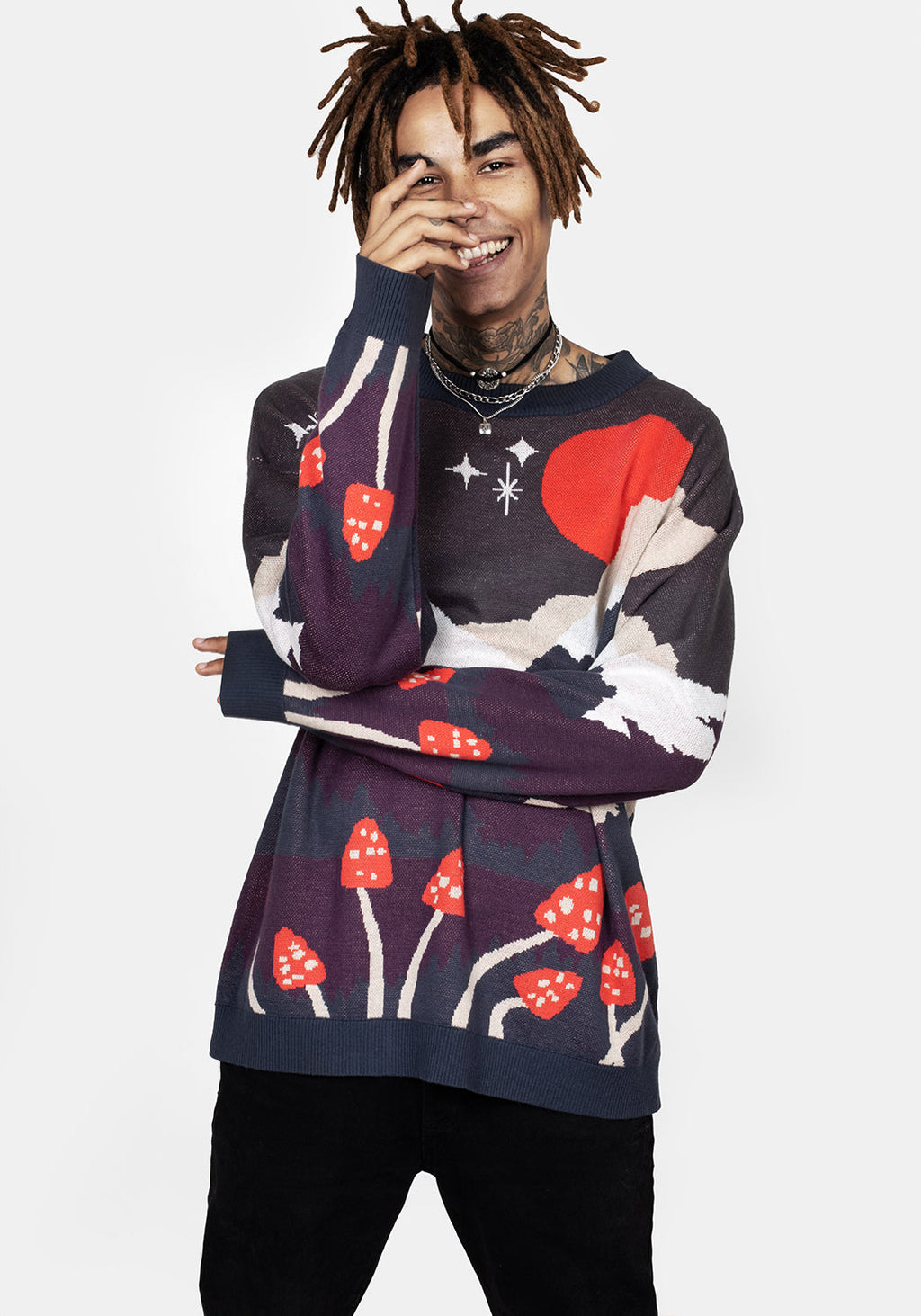 ✦ Colourful intarsia landscape graphic featuring a sunset over mountains and mushrooms - mirrored front and back