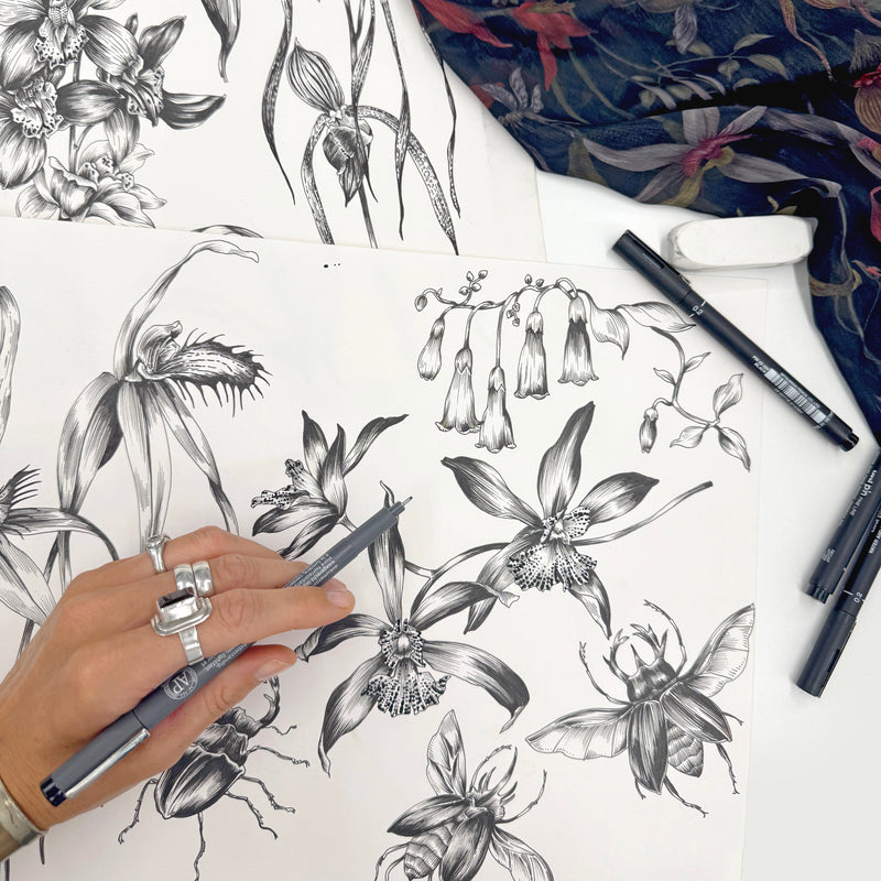 Every Disturbia piece starts with a pen, paper, and imagination. Our in-house artists hand-draw all our prints, motifs, and graphic assets, each one crafted like a chapter from a novella you'd be desperate to devour. These aren’t just clothes; they’re stories you wear.