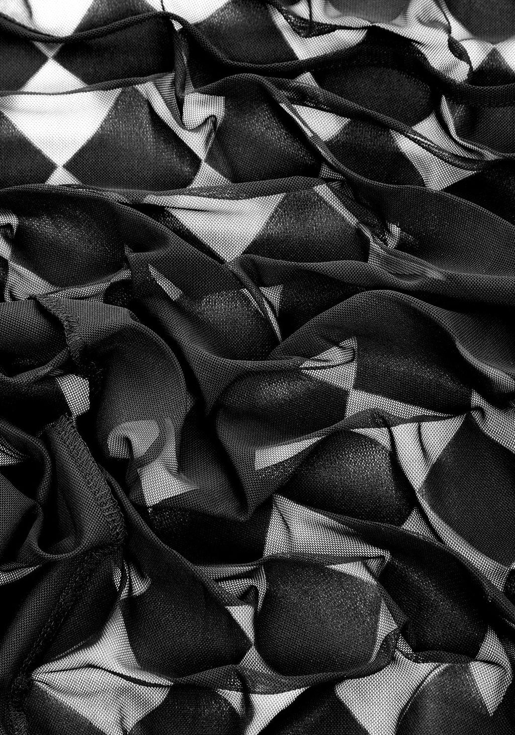 ♦ Sheer black mesh with all-over harlequin print