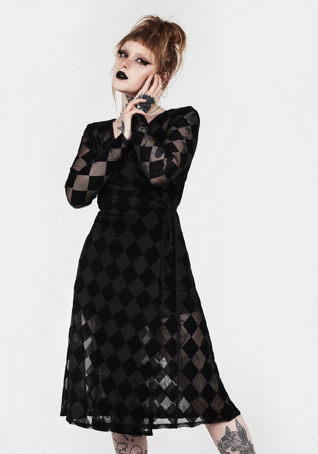 ♦ Harlequin mesh wrap long sleeve midi dress