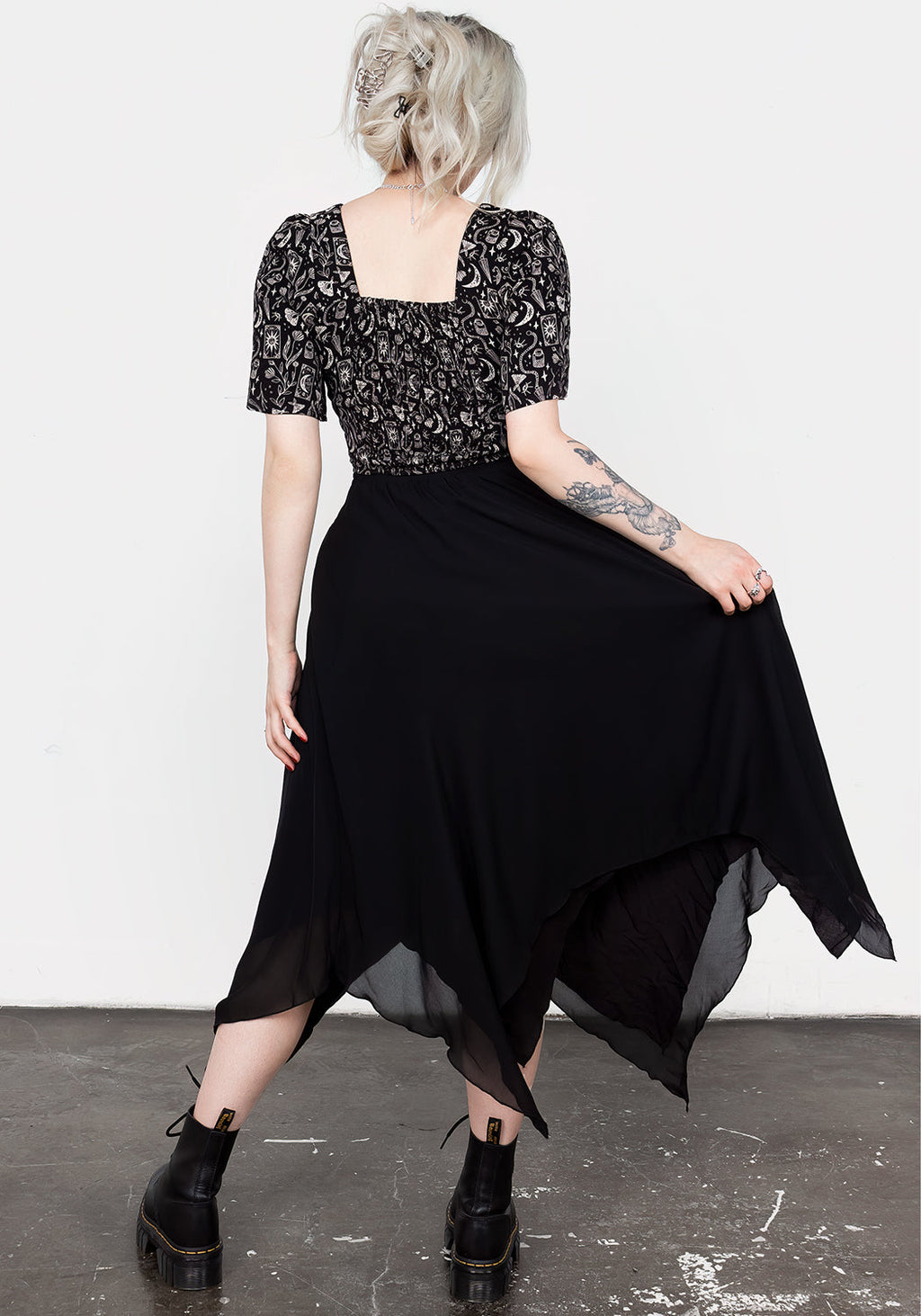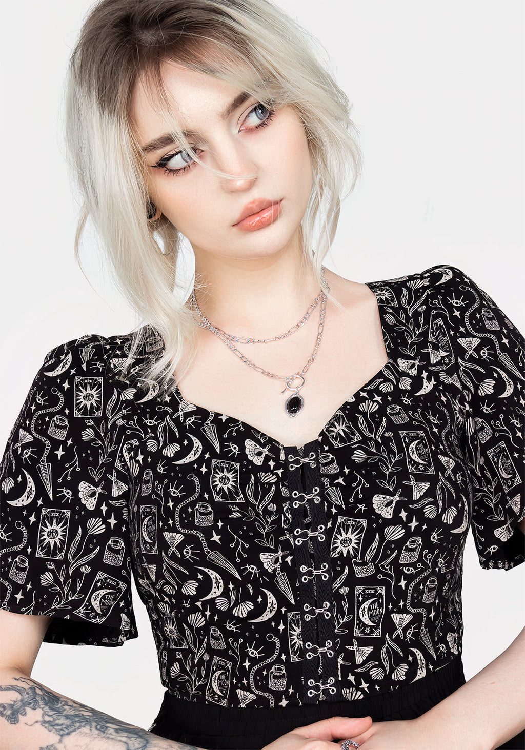 - All-over gothic witch discharge print in a creamy caramel colour (crisp & long-lasting)
