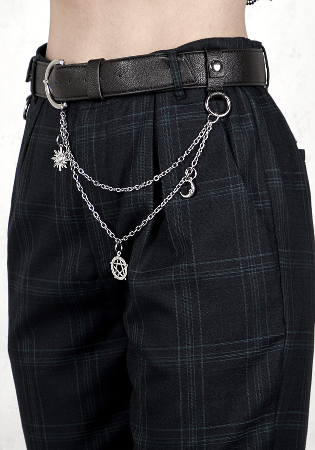 False leather hip belt with metal buckle and detachable metal chain with moon, star and pentagram charms.