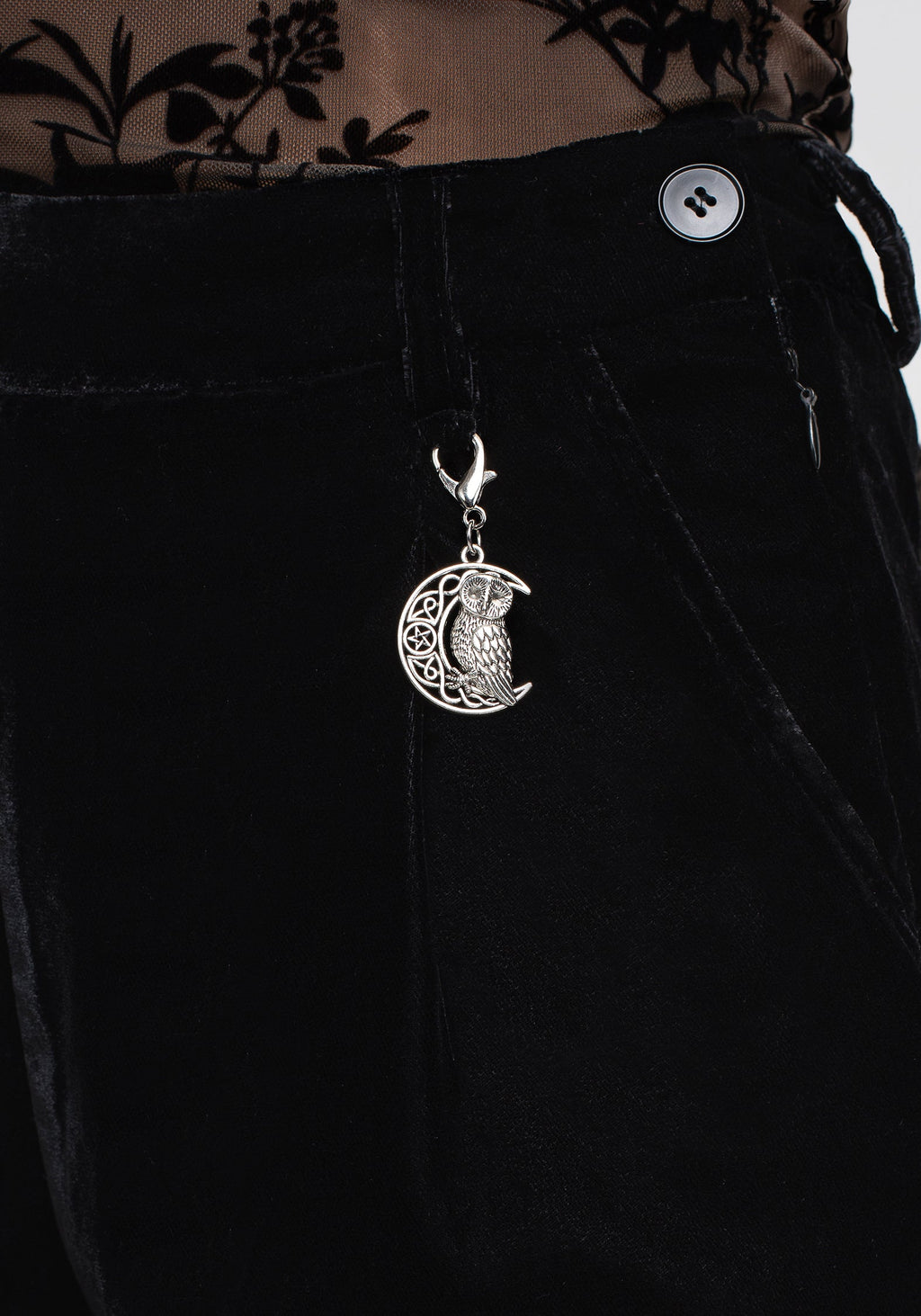 - Black velour tapered trousers with owl charm