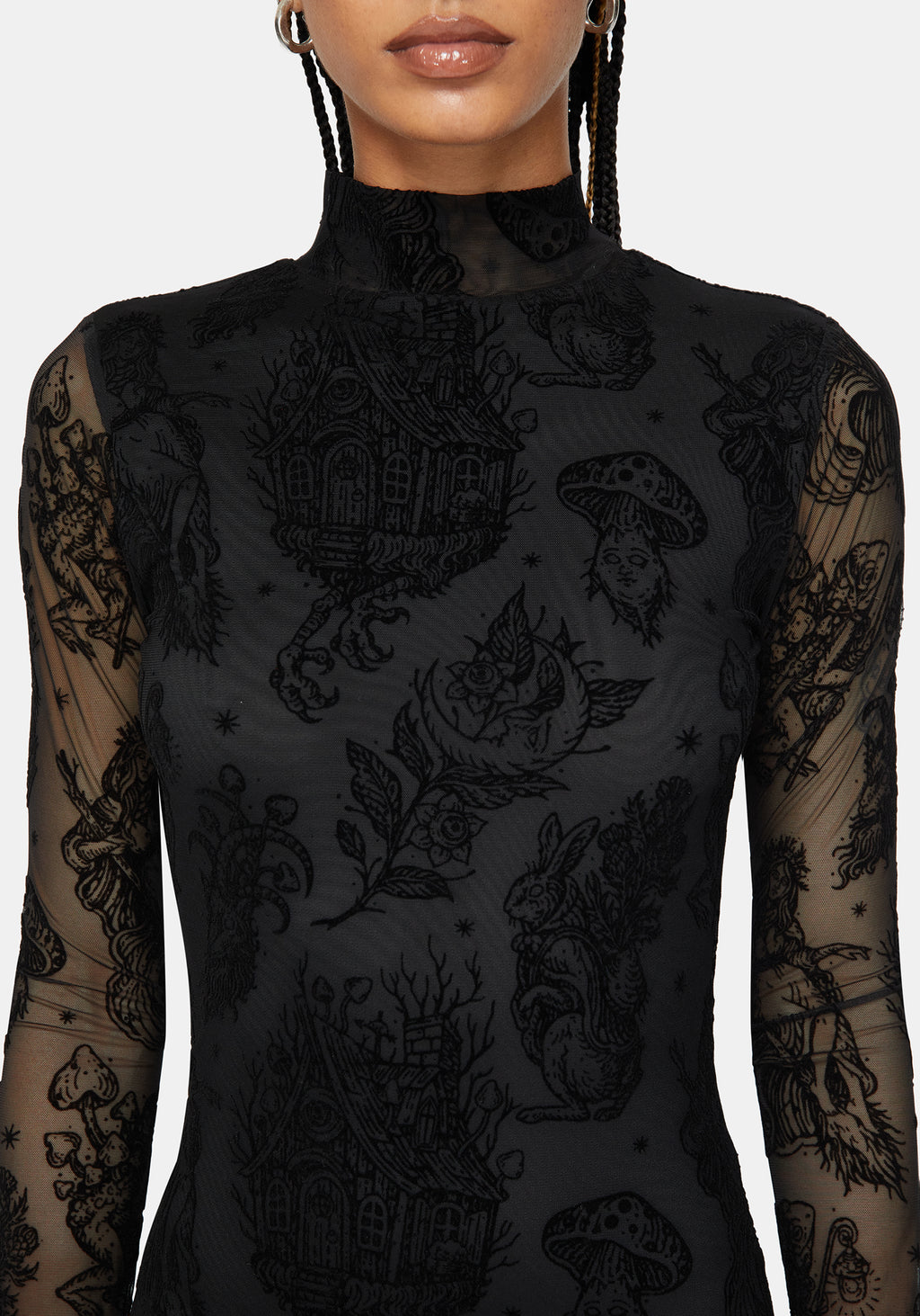 Hexborn Baba Yaga High Neck Flocked Long Sleeve Mesh Maxi Dress