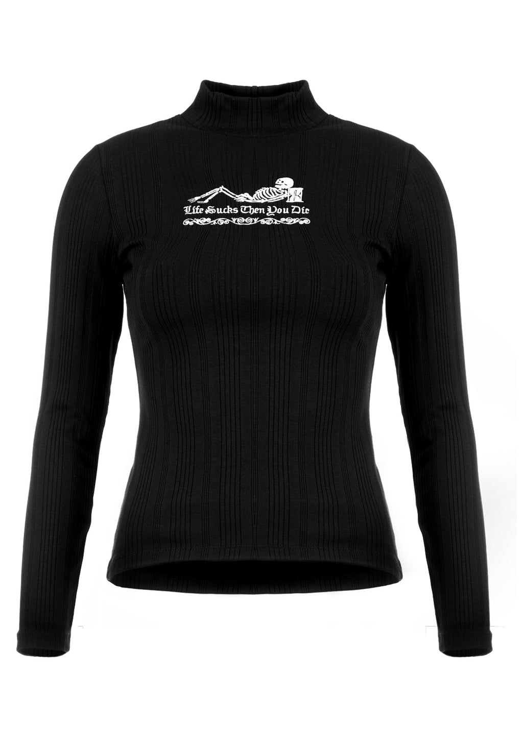 ✧ Front chest embroidery reads 'Life Sucks Then You Die' with skeleton design in white