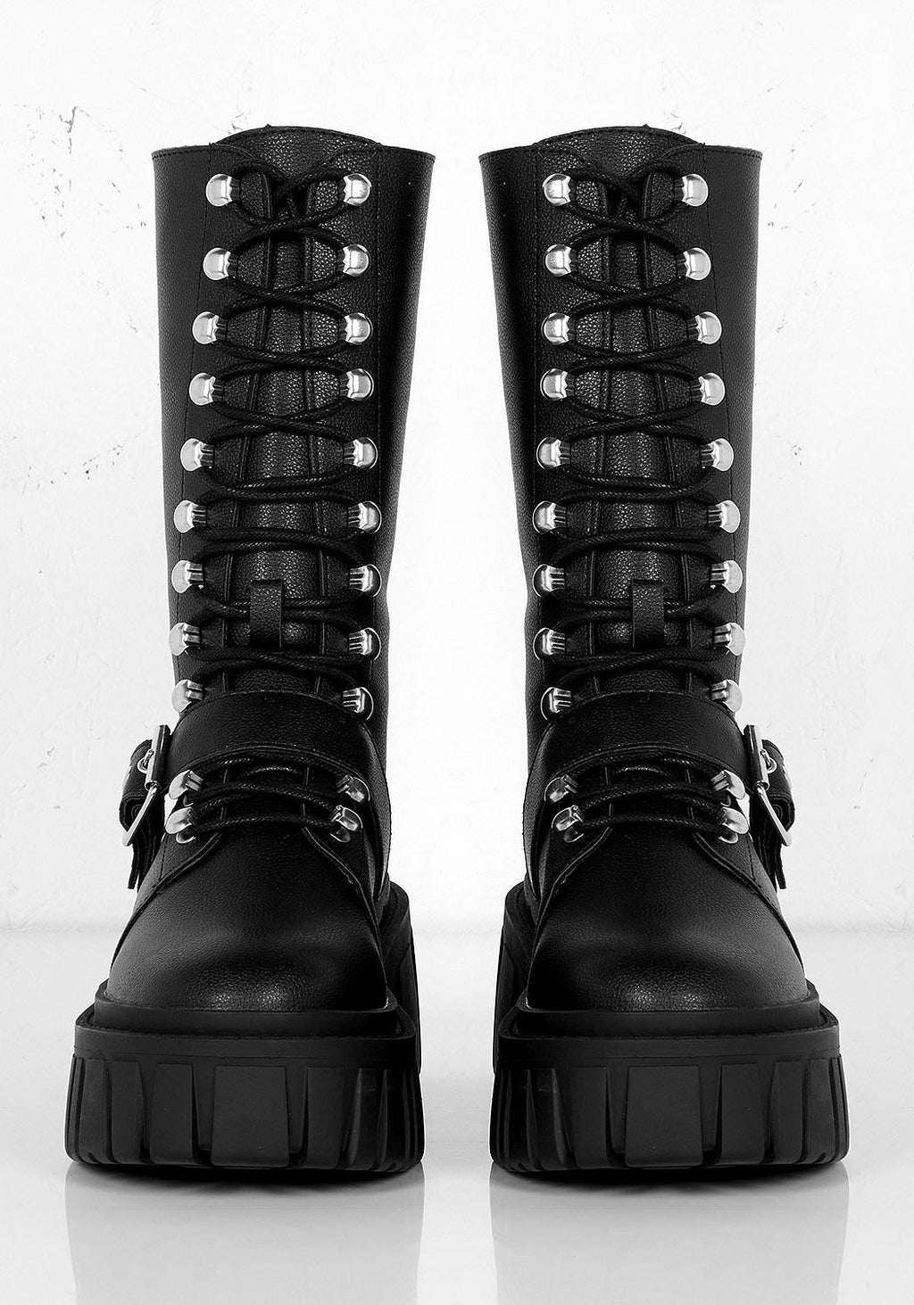 Premium faux leather, mid calf, lace up boot with statement sole.