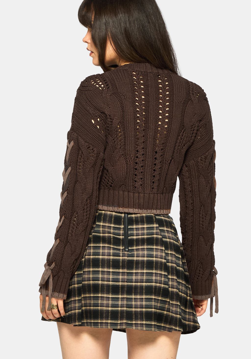 Sycamore Cotton Lace Up Sleeve Cable Knit Crop Jumper - Brown