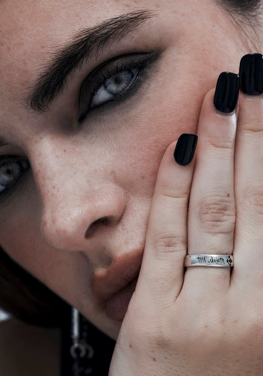 Two promises, one shadow - till death and beyond… the Forevermore collection presents a sterling silver ring featuring ‘Till Death’ engraving and black spinel stones, a gothic emblem of eternal devotion.